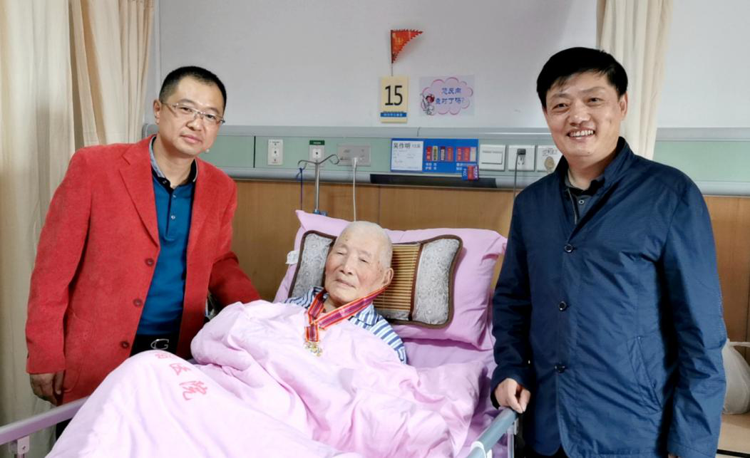 原煤炭公司94歲高齡的離休干部吳作明老人,因身體原因平時(shí)神智有些不清楚,但當(dāng)看到慰問(wèn)人員來(lái)看望并給他送抗美援朝紀(jì)念章時(shí),神情一下子清醒過(guò)來(lái),十分激動(dòng)地向大家舉手示意,眼里充滿感激淚花。