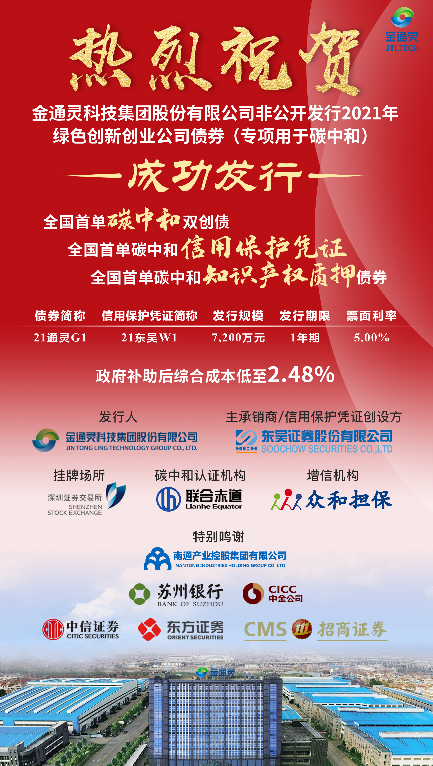 8月18日,南通產(chǎn)業(yè)控股集團控股的上市公司金通靈科技集團股份有限公司(SZ.300091,金通靈)非公開發(fā)行2021年綠色創(chuàng)新創(chuàng)業(yè)公司債券(專項用于碳中和)成功發(fā)行。債券簡稱“21通靈G1”,債券代碼“133055”,發(fā)行規(guī)模7200萬元,綜合融資成本年化僅為2.48% 。實現(xiàn)了3個全國首單,即全國首單碳中和知識產(chǎn)權質押債券,全國首單使用知識產(chǎn)權為債券提供質押擔保且募集資金用于碳中和領域的債券;全國首單碳中和雙創(chuàng)債券,全國首單創(chuàng)新創(chuàng)業(yè)公司發(fā)行的募集資金用于碳中和領域的債券;全國首單碳中和信用保護憑證,在南通眾和擔保提供全額擔保的基礎上,東吳證券為本次債券提供信用保護憑證,支持綠色知識產(chǎn)權質押實體企業(yè)融資發(fā)展,專項用于碳中和,在全國尚屬首次。本輪債券募集資金70%將用于中天鋼鐵綠色精品鋼項目余熱利用碳中和項目,30%用于如皋大型工業(yè)鼓風機新建項目。
