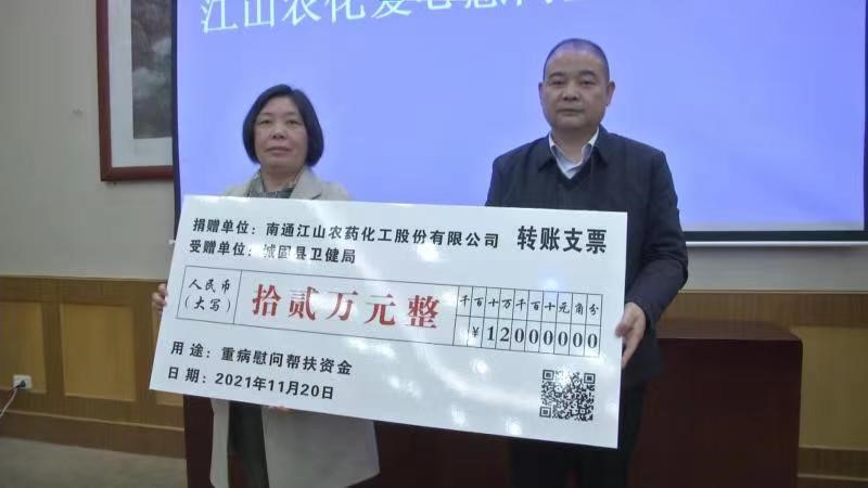 11月19-21日,江山股份參與南通開(kāi)發(fā)區(qū)管委會(huì)組織的蘇陜協(xié)助考察交流活動(dòng),在城固縣-南通開(kāi)發(fā)區(qū)對(duì)口協(xié)助交流座談會(huì)暨第十五次聯(lián)席會(huì)上,江山股份代表與城固縣衛(wèi)健局簽訂《城固縣重病戶(hù)慰問(wèn)幫扶協(xié)議》,并捐贈(zèng)十二萬(wàn)元用于幫扶城固縣40戶(hù)重病戶(hù)困難家庭。